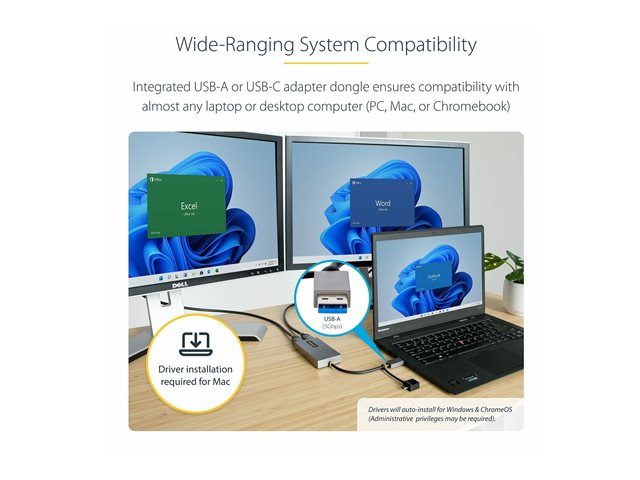 StarTech.com USB to Dual HDMI Adapter, USB A/C to 2x HDMI Monitors (1x 4K 30Hz, 1x 1080p), Integrated USB-A to C Dongle, 4in/11cm Cable, Windows & macOS - USB 3.0 to HDMI Multi-Monitor Display Adapter for Laptop (107B-USB-HDMI) - Videokort - USB typ A, USB-C hane till 2 x 19 pin HDMI Type A hona - grå - stöd för 4K